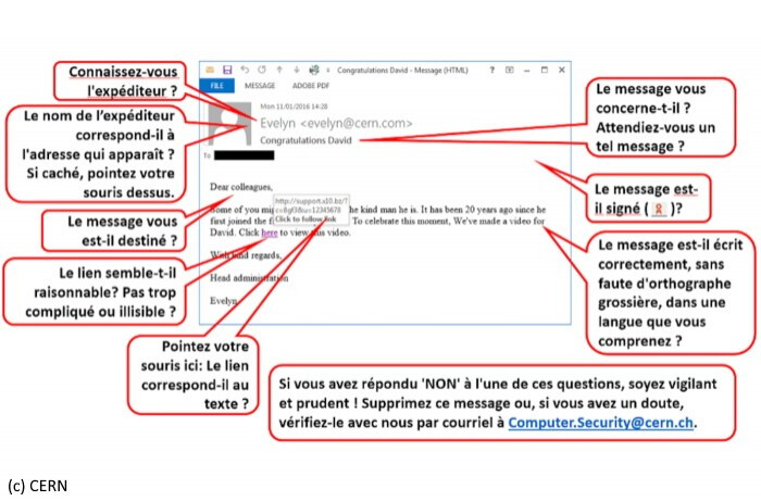 Dernier exemple en date : Le CERN a révélé que près de 8 % de ses collaborateurs avaient été piégés dans une opération de faux phishing organisée par l’organisme lui-même. Ce n’est pourtant pas faute de faire des campagnes de sensibilisation régulièrement en diffusant des recommandations comme celle-ci par exemple
